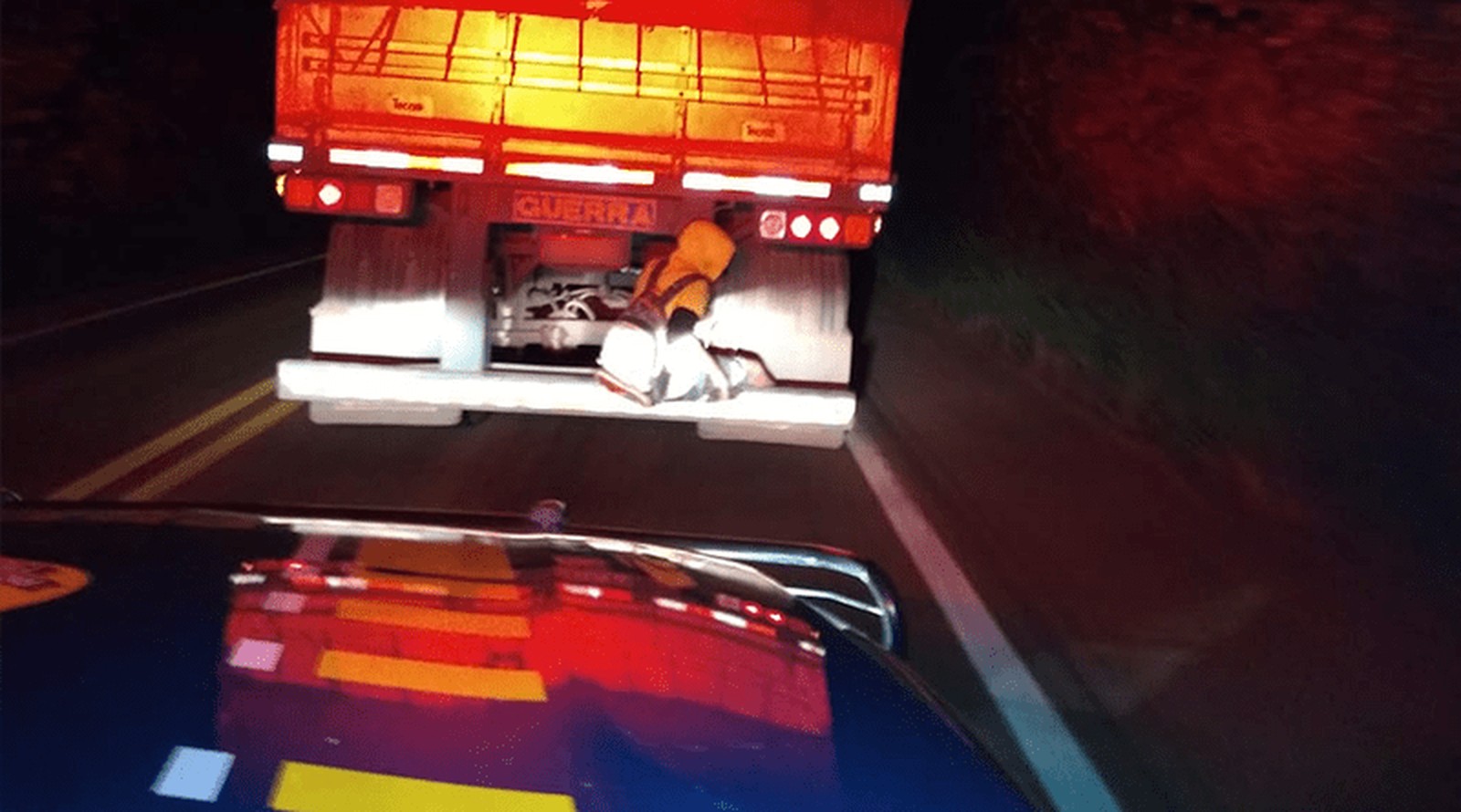 flagrou na noite de domingo (20) um homem pegando uma carona no para-choque