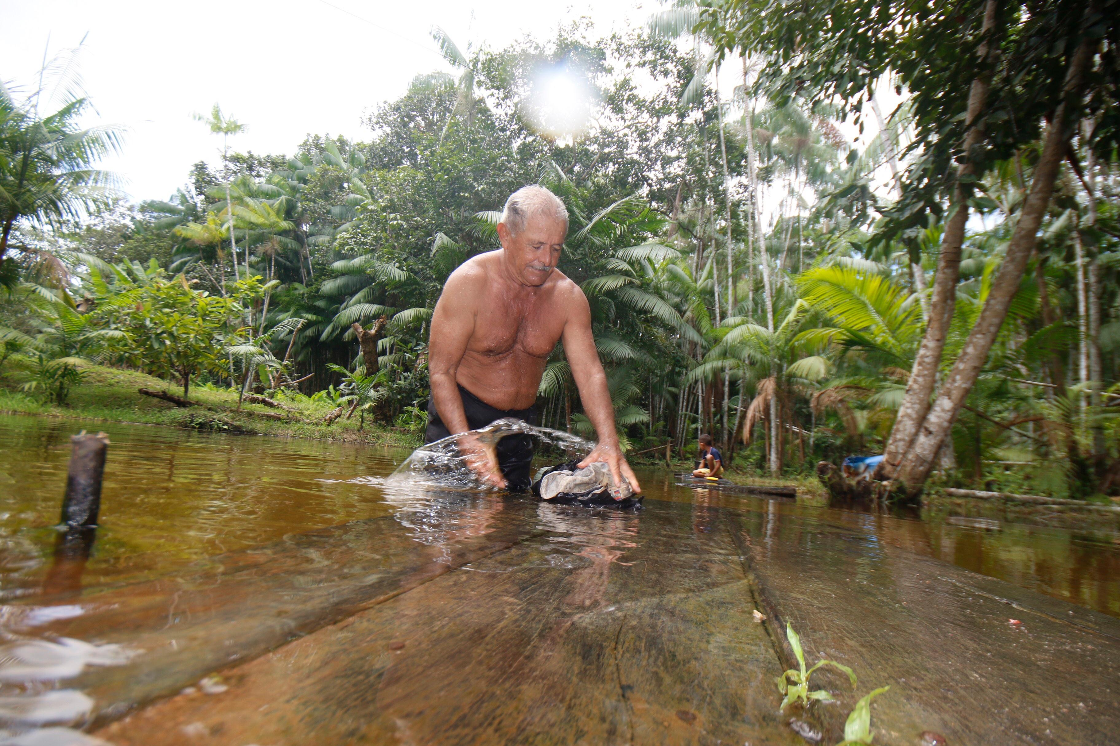 Nonato de Souza, de 67 anos tomando banho e lavando roupas em uma nascente em